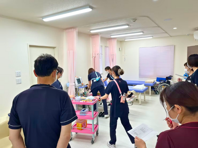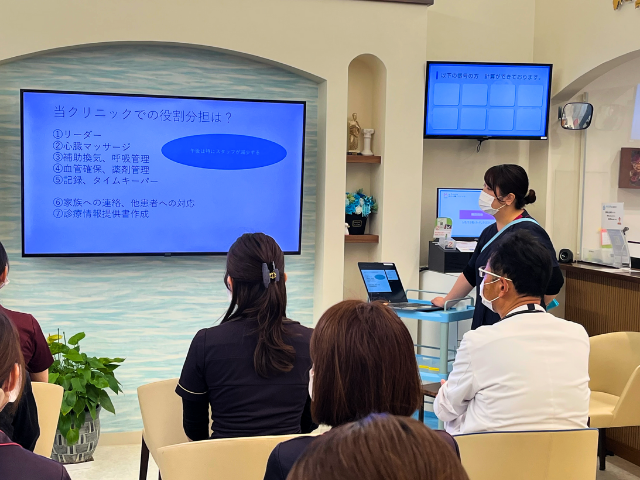 4月22日から1週間に渡って、看護師2名が中心となりBLS(一次救命措置)の研修を行いました。最終日にはスタッフそれぞれが役割分担し、実践形式をとっての研修をすることができ、有意義な時間でした。